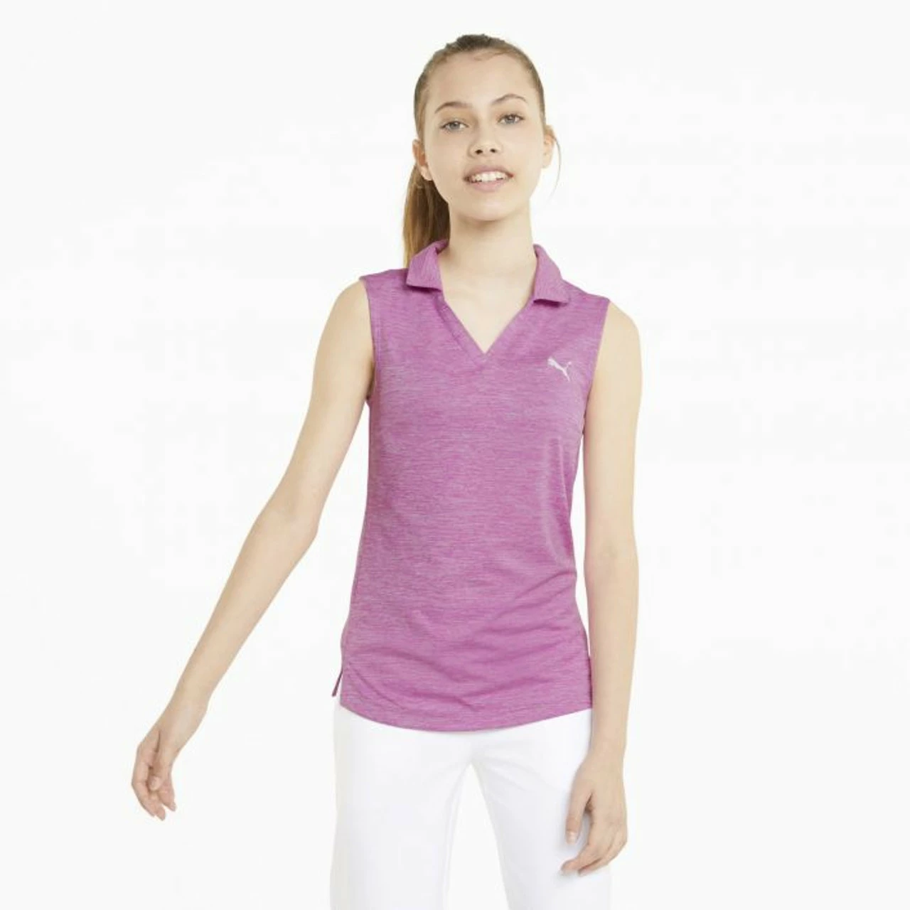 Look good and play with confidence in the Puma Girls Sleeveless Heather Polo. The soft heathered fabric with DRYCELL technology to wick moisture, this polo will keep you cool, dry, calm, collected and styling through your round.